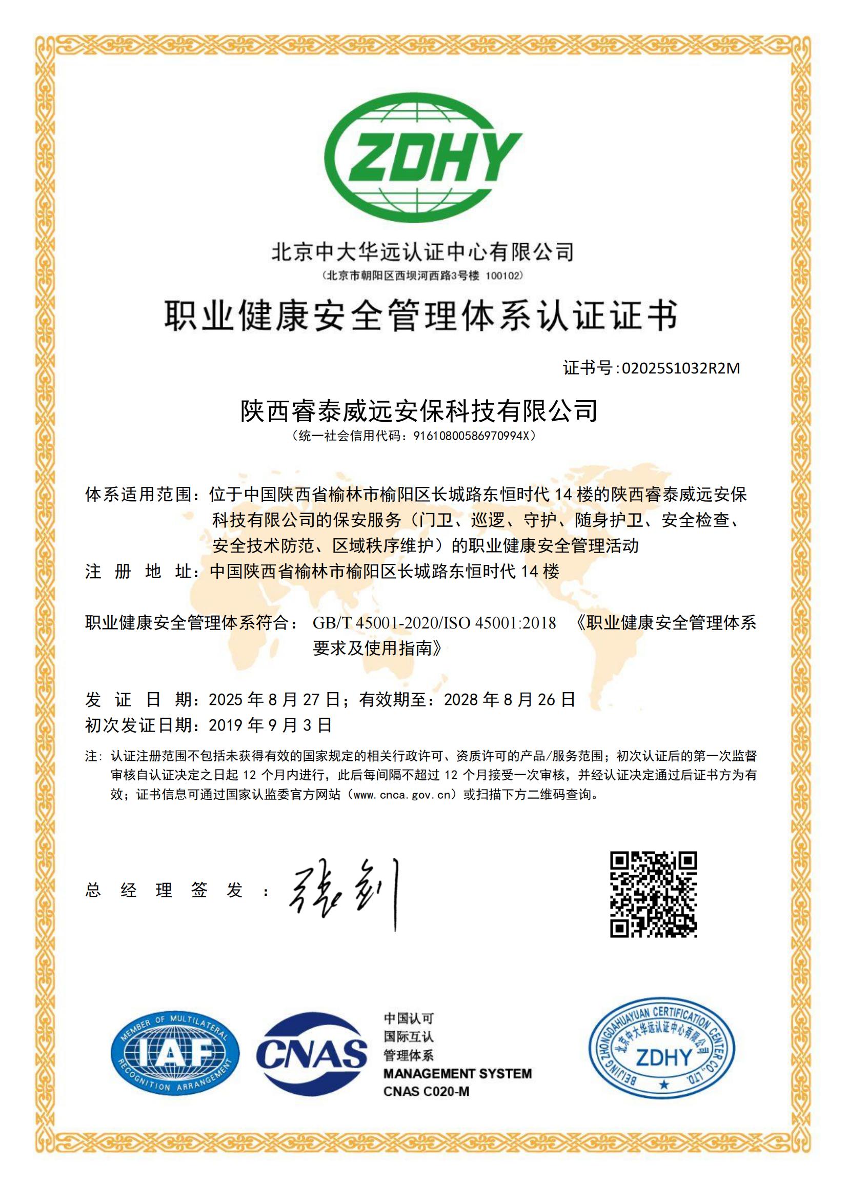 职业健康安全管理体系认证证书