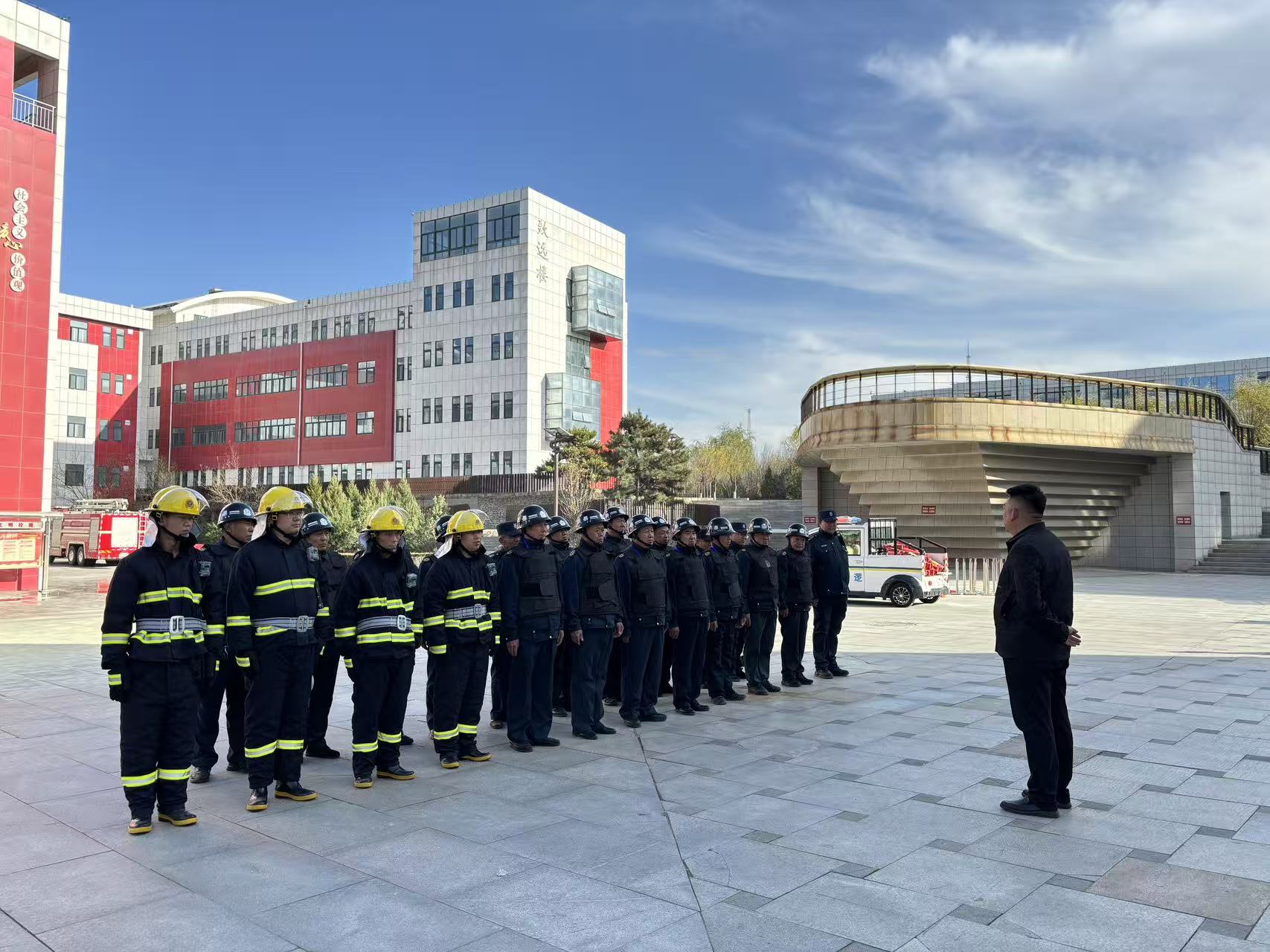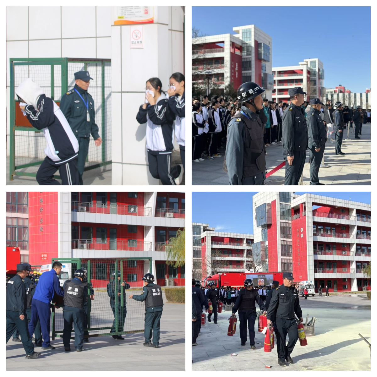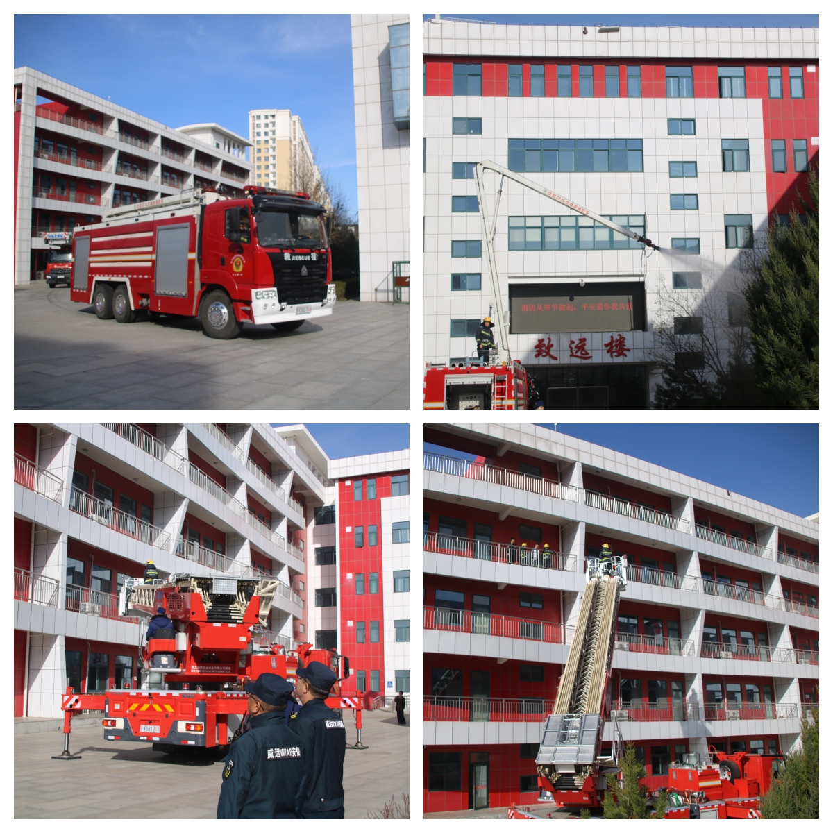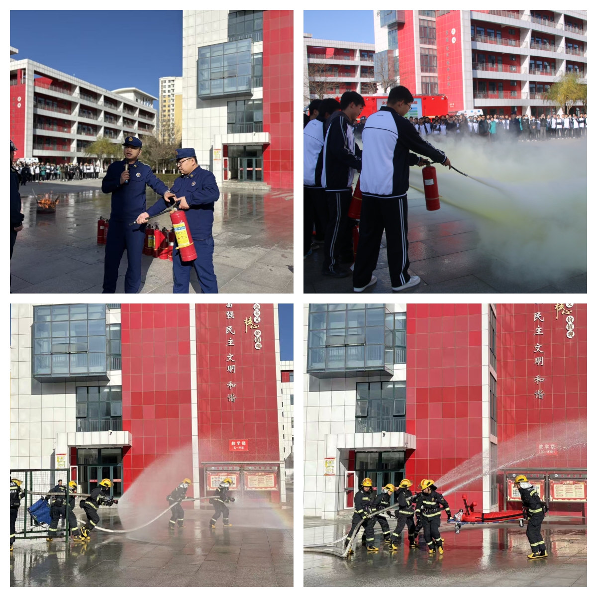 下午14:30,参会领导齐聚学校南门广场,在专业讲解员的引导下移步至观摩区。随着模拟火灾信号的发出,演练正式启动: