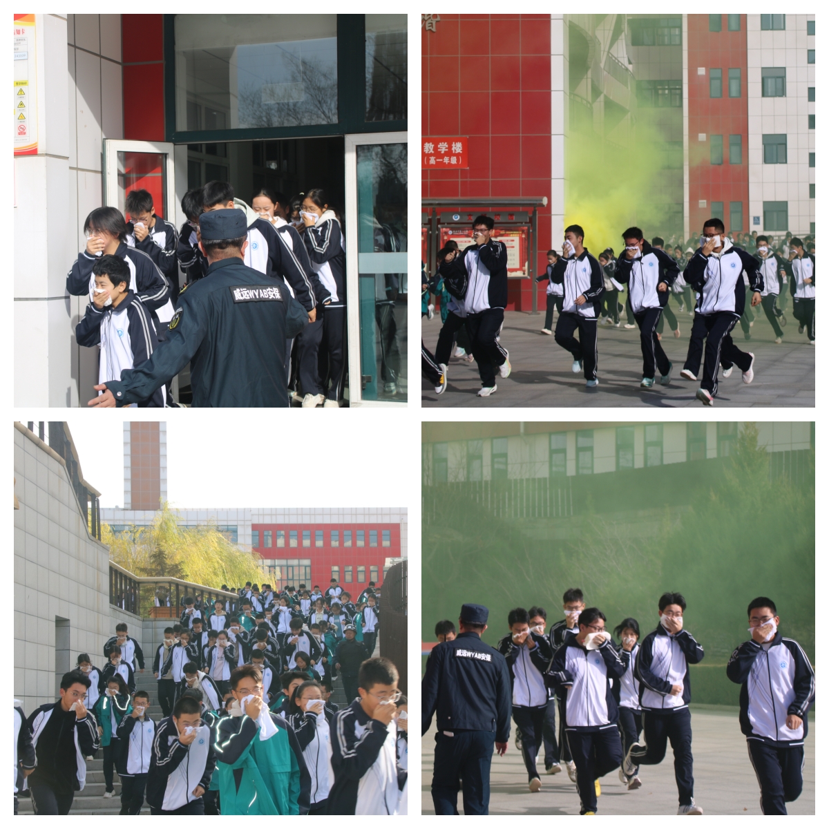 各班学生在老师组织下,迅速沿预定路线疏散,弯腰捂鼻、行动有序;